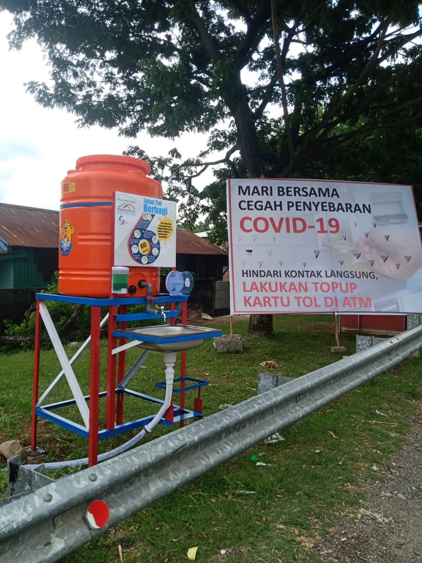 the office and operational areas to maintain more cleanliness as an effective step to reduce the spread. This spirit is then manifested through the provision of portable hand washing facilities by the Makassar Toll Management in 3 (three) different locations. These facilities are equipped with soap, tissue and trash cans so that they can be an adequate means to support optimal hygiene in the face of the Covid-19 pandemic.