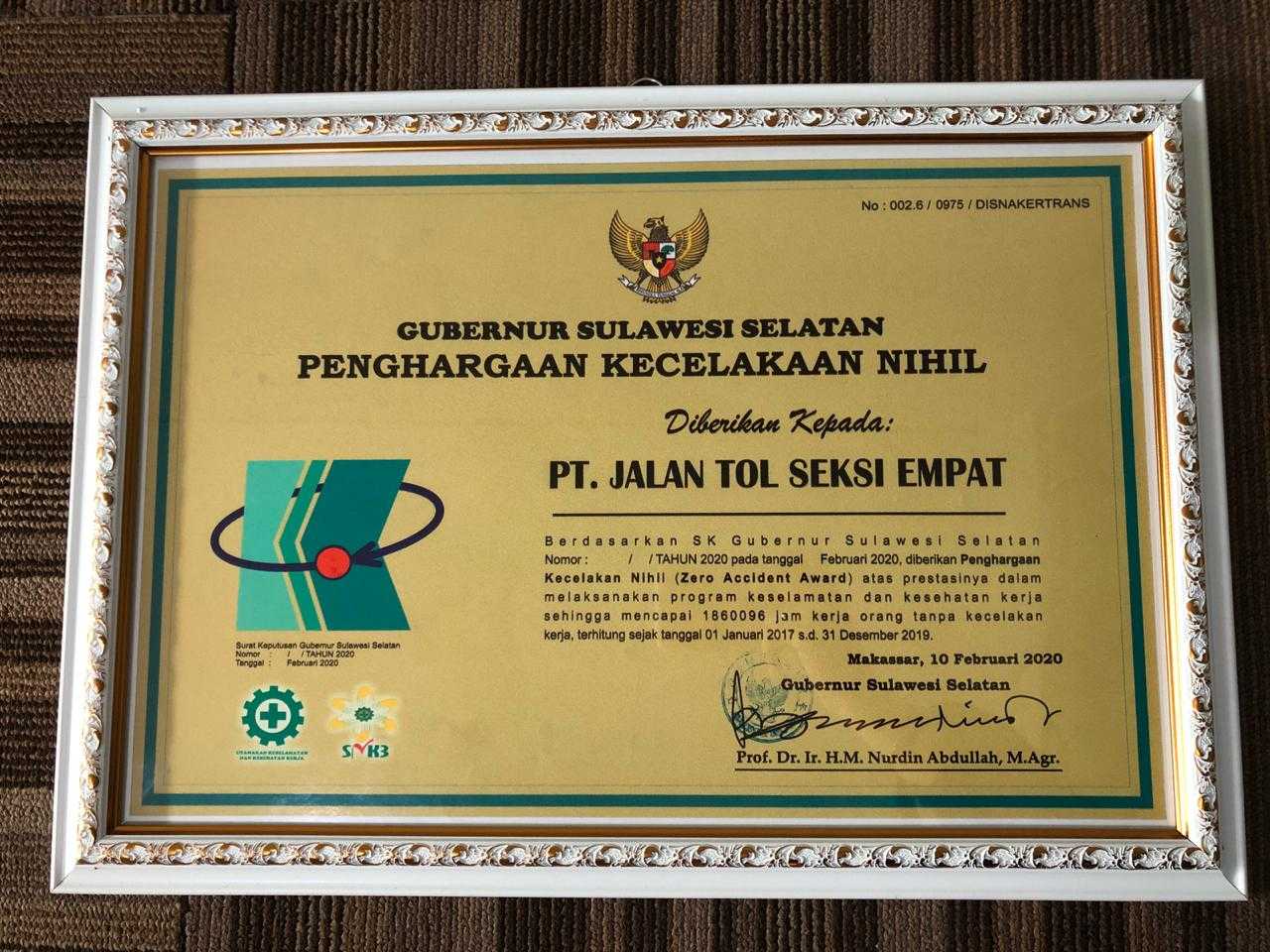 The First Award, Management achievements that have successfully implemented occupational safety and health programs up to 1,860,096 working hours without any work accidents (zero accident) starting from January 1, 2017, to December 31, 2019. The second award is given for the performance of the Occupational Safety and Health Advisory Committee (P2K3) which has carried out its duties properly by creating a conducive and safe atmosphere in the Company's work environment. The third award is for the team's achievement in terms of compliance with the implementation of labor laws above 80%. The fourth award was achieved by the Management for the best performance of the Company which has implemented an occupational safety and health (OHS) system in all of the Company's work areas.