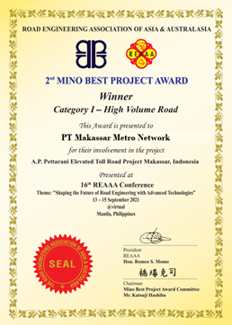 The AP Pettarani Elevated Toll Road won an award in the high-volume road category at the International 2nd Mino Best Project Award event organized by Road Engineering for Asia and Australasia (REAAA). This success was conveyed at the Second Mino Best Project Award Ceremony at the 16th REAAA Conference in Manila which was held virtually on September 13-15 2021 with the theme of "Shaping the Future of Road Engineering with Advance Technology". The AP Pettarani Elevated Toll Road project won the trust of the Indonesian Road Development Association (HPJI) to represent Indonesia. Mino Best Project Award is an award ceremony for the best new road and bridge projects located in the Asia and Australasia Region which is held every four years. Some of the countries are involved and participating in this event include Indonesia, Myanmar, Malaysia, Philippines, Thailand, Mongolia, Taiwan, Japan and Australia.