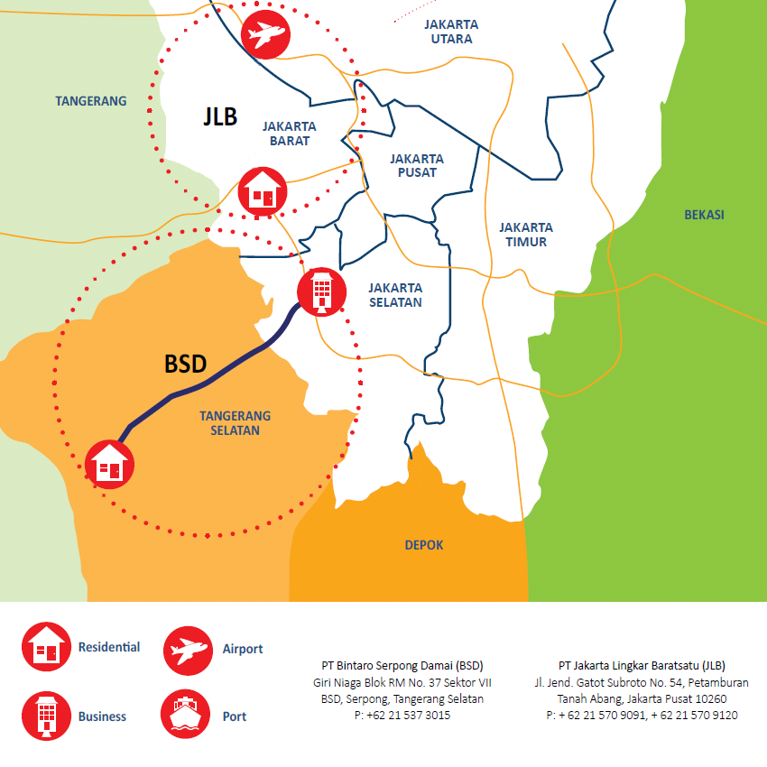 BSD toll road provides direct access from urban area to Jakarta inner city (Central Business District). The 7.25 km toll road connects Serpong and Pondok Aren, South Tangerang. Its commercial operation started in 1999. Throughout 2015, the Average Daily Traffic Volume was 79,132 vehicles. The compound annual growth rate (CAGR) traffic from 1999-2015 is 19.4%.